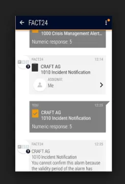 Em uma situação de emergência ou risco, o FACT24 permite notificar e alertar rapidamente todas as pessoas relevantes para o caso, departamento ou meio ambiente, realizar conferências improvisadas ou abrir uma linha direta de informações para os moradores locais e a mídia a curto prazo e prevenir imediatamente a situação. Além disso, você pode trocar informações e arquivos com todas as equipes envolvidas em tempo real.